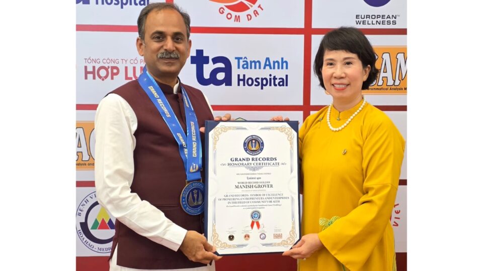 नई दिल्ली, सितंबर 26: भारत के प्रख्यात आयुर्वेद गरुु और HIIMS (Jeena Sikho) के संस्थापक आचार्य मनीष जी को 21 सितंबर, 2025 को, Ho Chi Minh City में आयोजित Vietnamese Record Holders convocation समारोह में प्रतिष्ठित “Grand Records WorldKings Honorary Certificate” से सम्मानित किया गया।